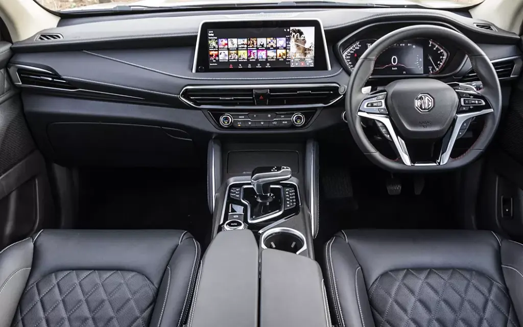 Step inside the MG Gloster, and it immediately gives you a sense of luxury. The interior uses soft-touch materials, leather upholstery, and chrome accents. The dashboard layout is clean, and the large 12.3-inch touchscreen infotainment system takes centre stage.